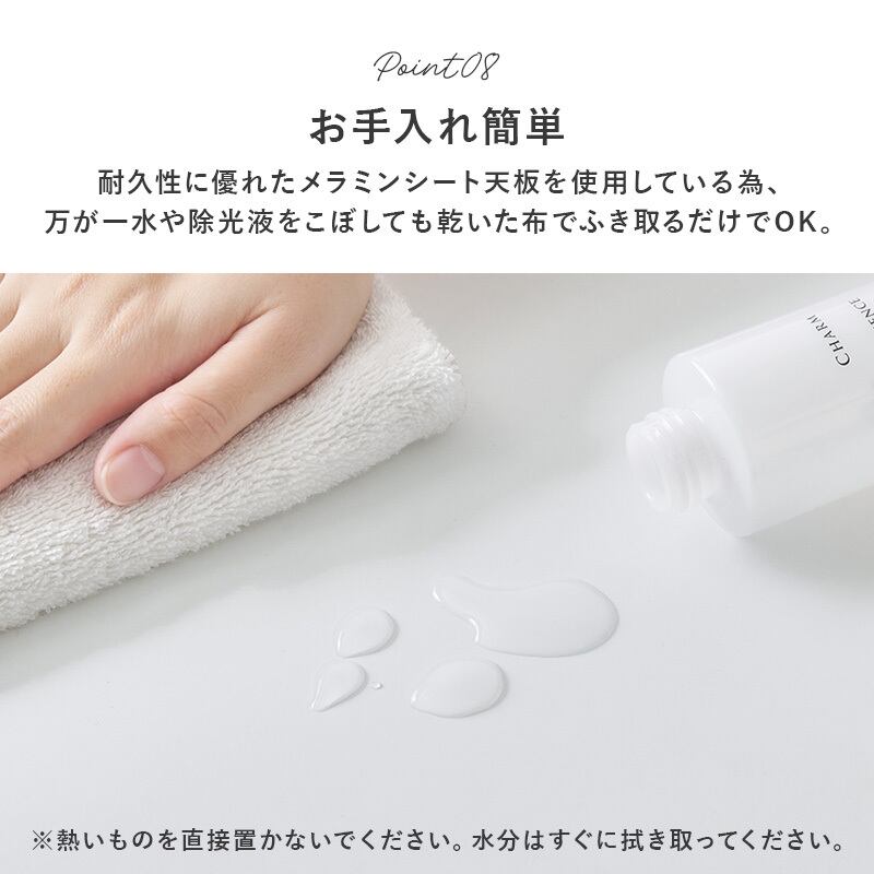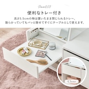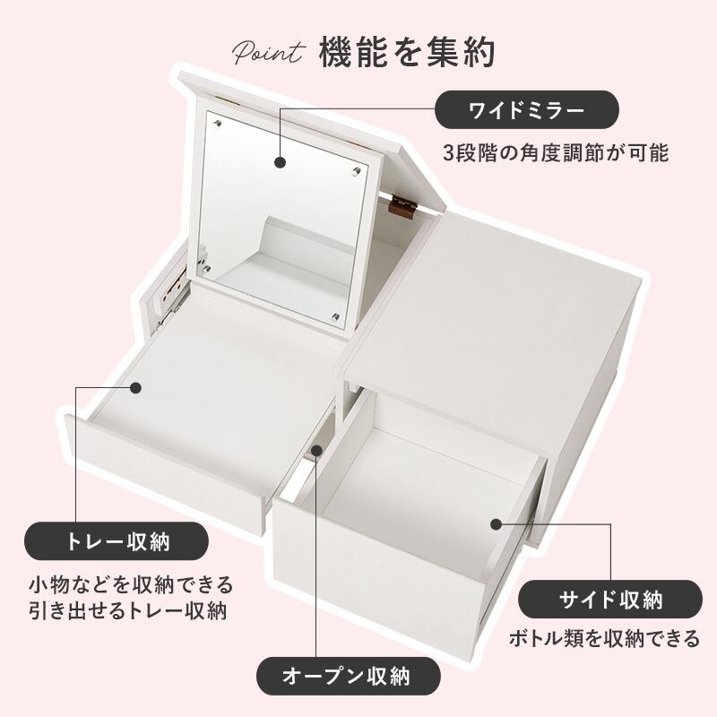 高さ調整できるワイドミラーは角度を3段階に調整可能。スキンケアやメイク時も見やすく、使い勝手抜群です。トレー収納・サイド収納・オープン収納を完備し、コスメやアクセサリー、ボトル類までしっかり整理整頓できます。