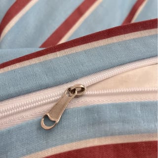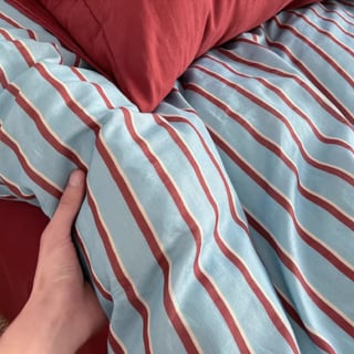 爽やかなスカイブルーに深みのあるボルドーラインを合わせた、印象的なストライプデザイン。明るさのある配色ながら落ち着きもあり、寝室のアクセントになるカラーです。