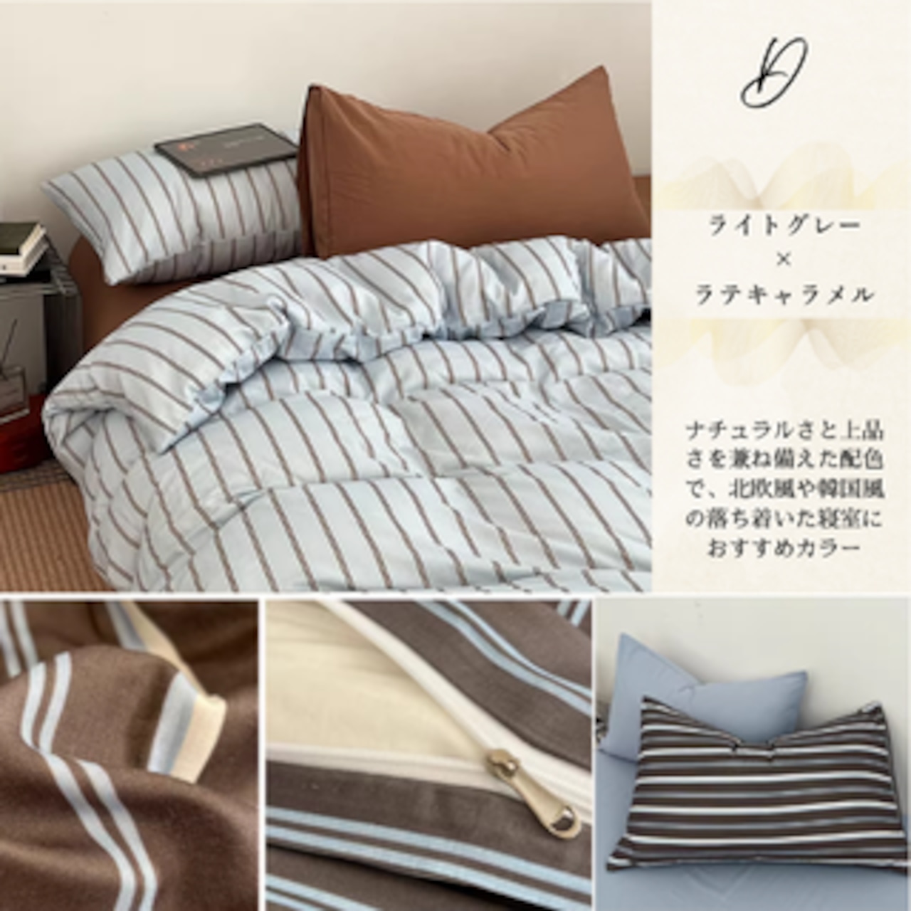 やさしいライトグレーにラテキャラメルのアクセントを効かせた、温もりのあるストライプデザイン。ナチュラルさと上品さを兼ね備えた配色で、北欧風や韓国風の落ち着いた寝室におすすめです。木目家具やベージュ系インテリアとも合わせやすく、季節を問わず使いやすいカラーです。