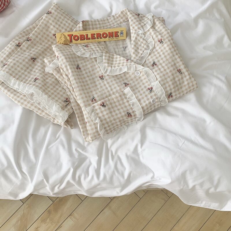 2color⋆M~XXLサイズ有◎ギンガムチェック チェリー柄 ルームウェア セットアップ 上下セット 韓国デザイン 韓国ルームウェア アイボリー ブルー