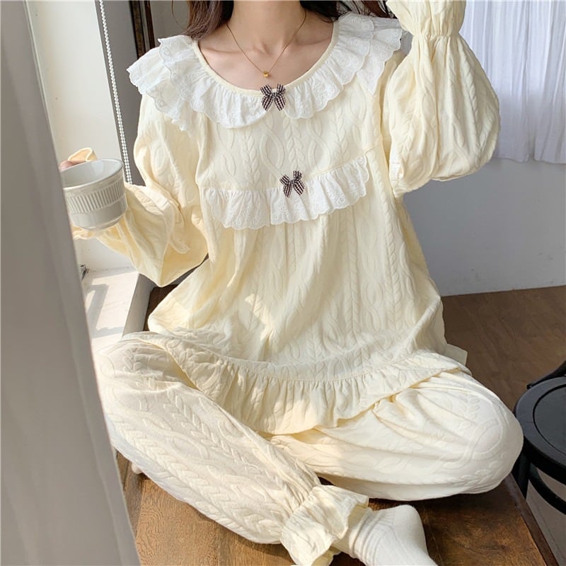≪予約有≫M~XXLサイズ有◎レース フリル キャンディスリーブ リボン ルームウェア 上下セット セットアップ