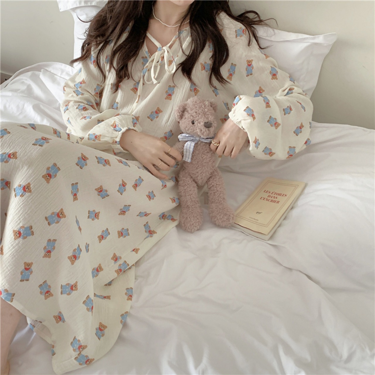 M~XXLサイズ有◎小さなクマ柄 ルームウェア 上下セット セットアップ パジャマ 首元リボン 長袖 春用 秋用 韓国