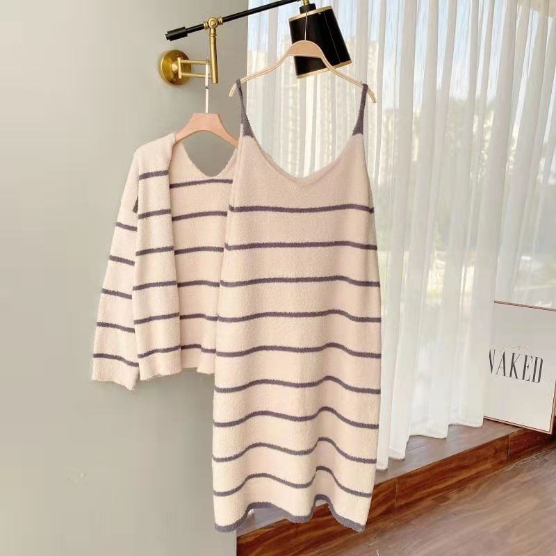 ルームウェア カーディガン セクシー もこもこ ワンピース レディース 冬 韓国 ファッション ニット ボーダー キャミソール 寝巻 セットアップ ガウン おうちコーデ ワンピ 秋 キャミ 上下セット ロング丈 ボーダー 可愛い オルチャン カジュアル 大人