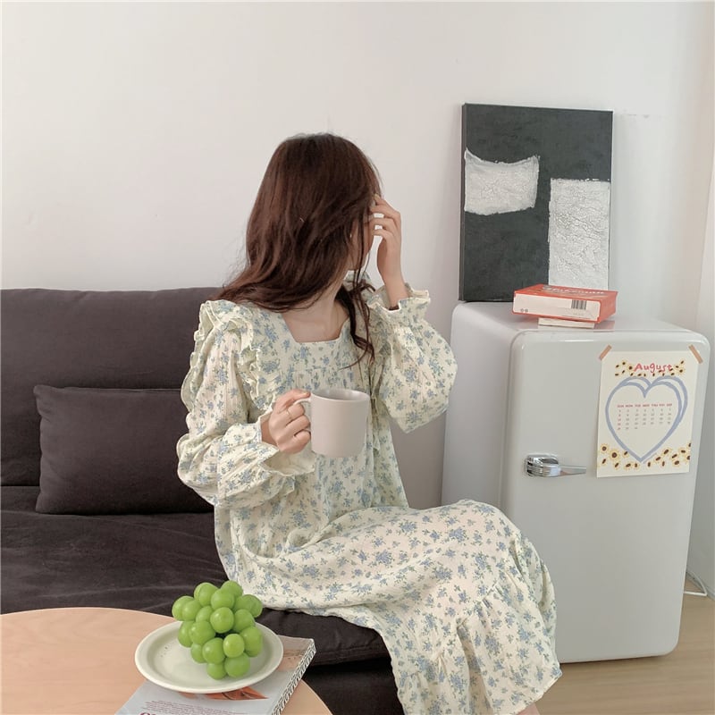 S~XLサイズ有◎スクエアネック フリル ブルー花柄ルームウェア ワンピース 韓国ルームウェア パジャマ ホワイト 青の小さいお花 韓国デザイン ブルべ肌
