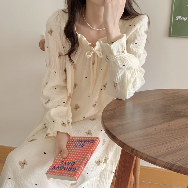 S~XLサイズ◎長袖 半袖 2タイプ有◎くま柄リボンワンピース 裾レースくまちゃん総柄ワンピース ルームウェア 韓国ファッション 韓国ルームウェア