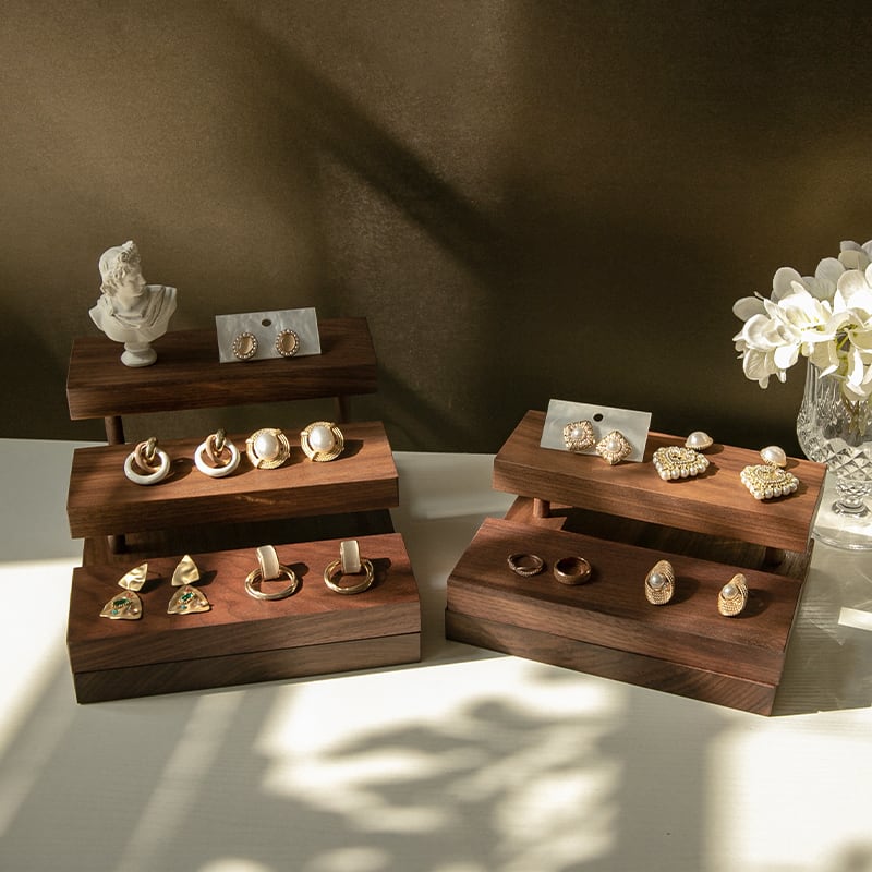 2段~5段/木製 ディスプレイラック 3段 4段 ディスプレイ什器 ウッドステージ ブラウン 北欧雑貨 撮影小物 アクセサリー 収納 スタンド 木製 ディスプレイ 店舗 什器 ジュエリー 指輪 ピアス イアリング 天然木 無垢材