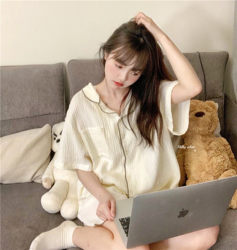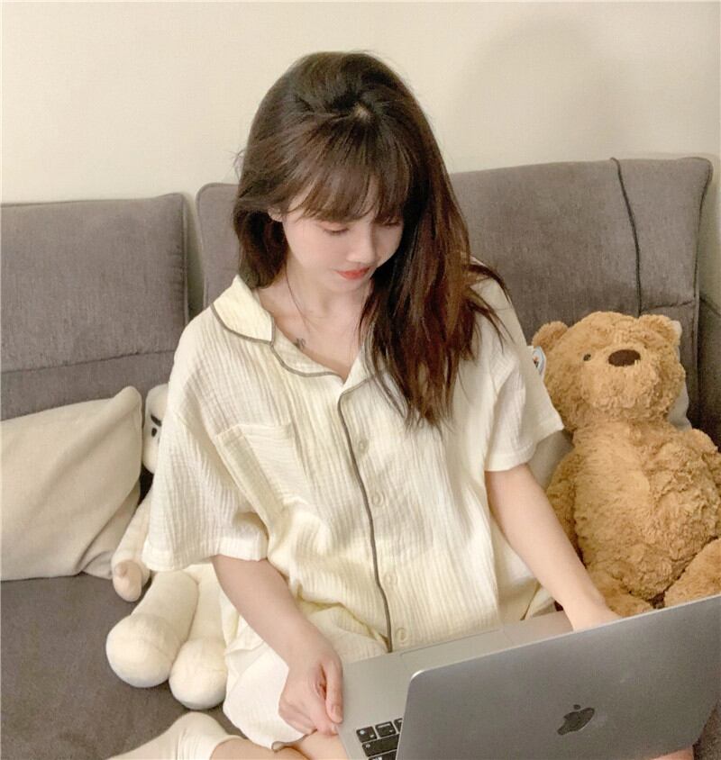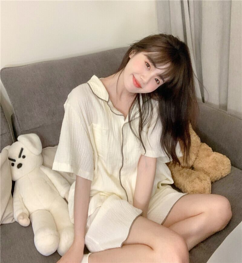 バイカラールームウェア パジャマ 上下セット 半袖 ハーフパンツ アイボリー