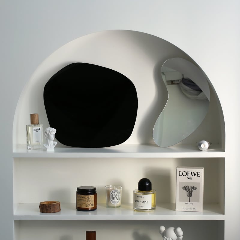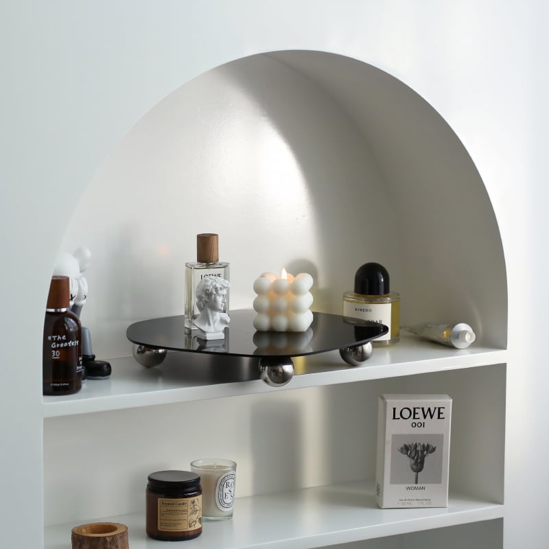 モードなブラックと光沢のあるシルバー、丸みのあるシルエットは、クールな雰囲気のモダンスタイルから優しさのある北欧スタイルお部屋まで様々なお部屋の雰囲気にマッチするアクセサリープレートです。