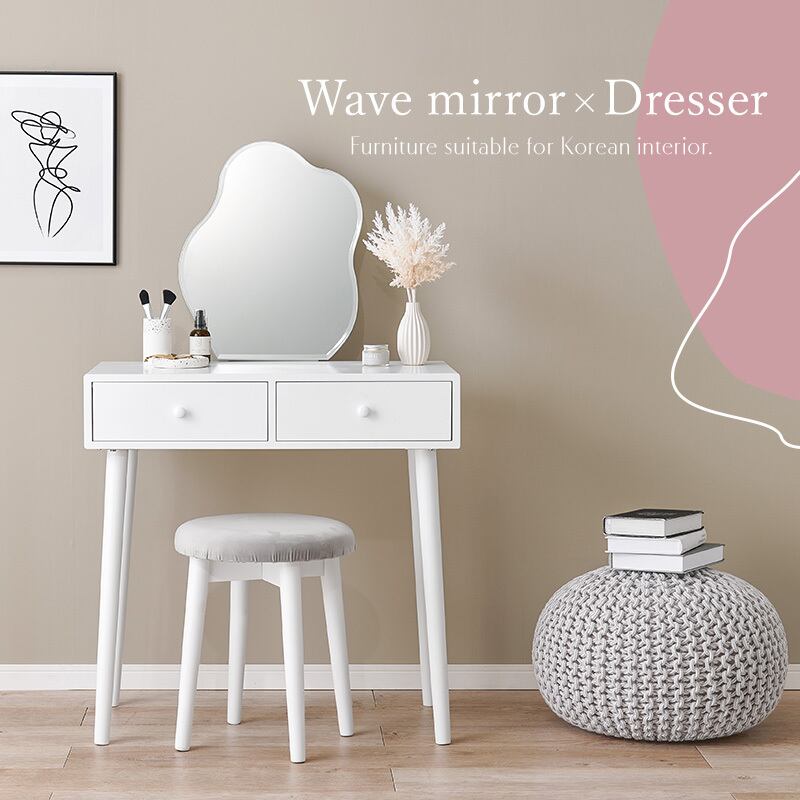ホワイトのシンプルな本体に特徴的なウェーブミラーを合わせた大人可愛いデザインのドレッサーセット。たっぷり収納ができて、一緒に使えるスツール付と使い勝手も優れています。