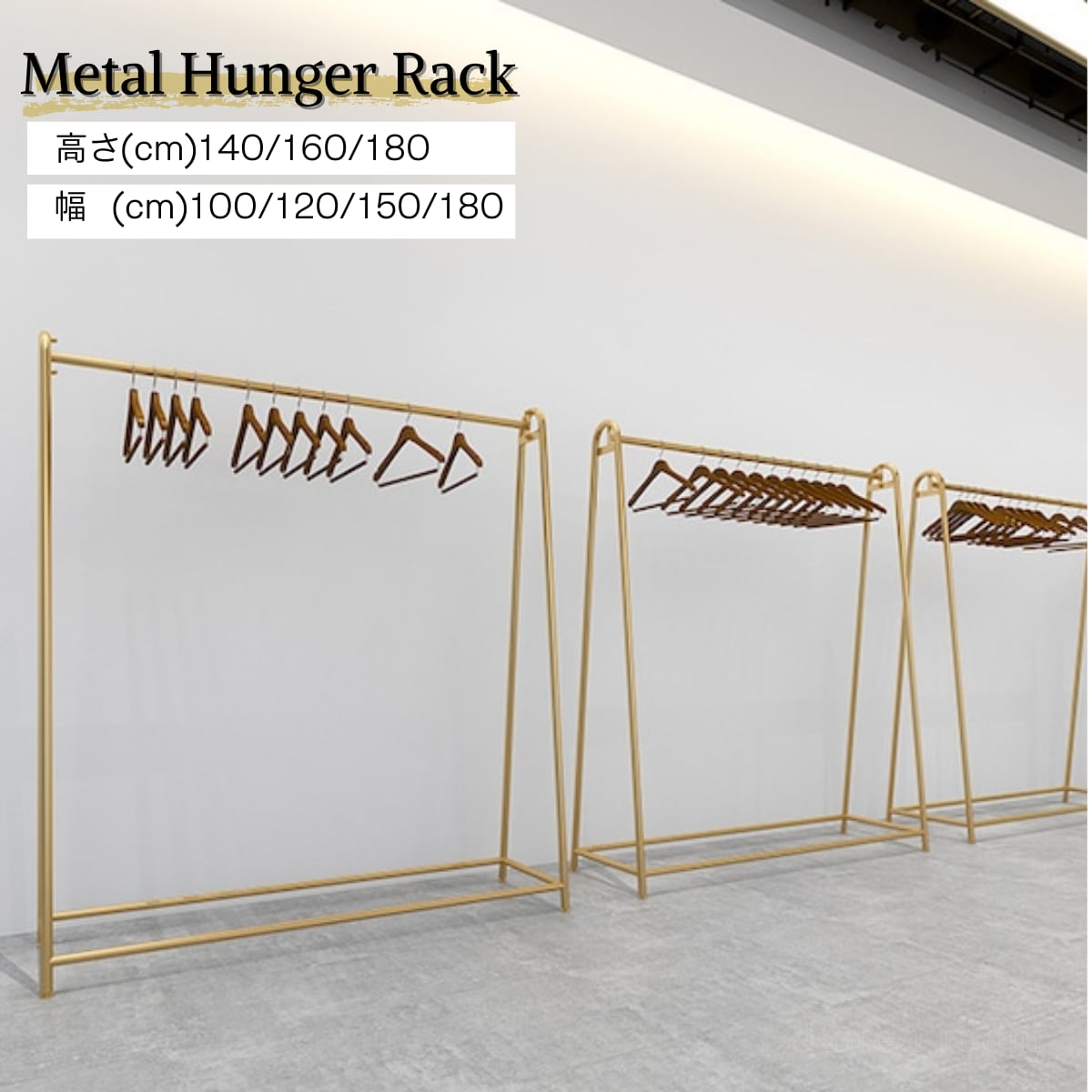 メタルハンガーラック ゴールド 高温焼付塗装 業務用 頑丈 北欧インテリア 幅100/120/150/180 高さ140/160/180 洋服ラック アパレル 店舗什器 パイプハンガー シンプル おしゃれ ディスプレイ収納 クローゼット 衣類収納 展示用 見せる収納 耐荷重 モダン ショップ用